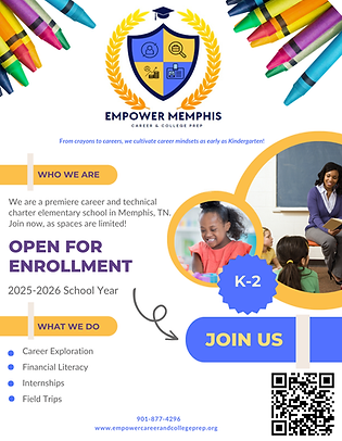 In partnership with families, Empower Memphis Career and College Prep is a K-8 charter school, with an unwavering obligation to accelerate academic achievement, foster individuality, and cultivate career mindsets, of all students, as early as Kindergarten. Through differentiated instruction, interest-based studies, leadership development, and career simulations and internships. Empower Memphis Career and College Prep students are invested in their future and prepared to pursue their career paths of choice with confidence and conviction.